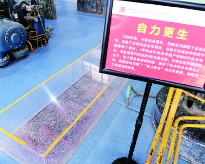 沿著紅色大道,走進(jìn)蘇式建筑的辦公樓,踩著水磨石樓梯,進(jìn)入連廊,一件件老物件擺放在連廊區(qū)的展柜里:二十世紀(jì)五六十年代的操作證、工作證、洗澡證等各類證件、飯盒,以及印有俄文的設(shè)備銘牌都在向參觀者講述著過(guò)去的故事。走過(guò)展區(qū),經(jīng)過(guò)電力文化長(zhǎng)廊就進(jìn)入“汽輪機(jī)檢修實(shí)操間”,也就是過(guò)去的設(shè)備車間。5臺(tái)大型汽輪機(jī)組靜靜地躺在車間里。大型轉(zhuǎn)子以及印有俄文的1號(hào)汽輪發(fā)電機(jī)還原著當(dāng)時(shí)車間的原貌。操作間外地面上刻著“中蘇友好”“自力更生”等標(biāo)語(yǔ)被玻璃罩保護(hù)著,整個(gè)車間從中蘇共建的1號(hào)機(jī)組到自建的4號(hào)機(jī)組和地面的標(biāo)語(yǔ)刻字,反映新中國(guó)成立初期蘇聯(lián)的歷史援建和在沒(méi)有外援的情況下自力更生自建機(jī)組的發(fā)展過(guò)程。一個(gè)車間還原一段歷史,再現(xiàn)了二十世紀(jì)五六十年代的歷史變遷與電力文化特色。
