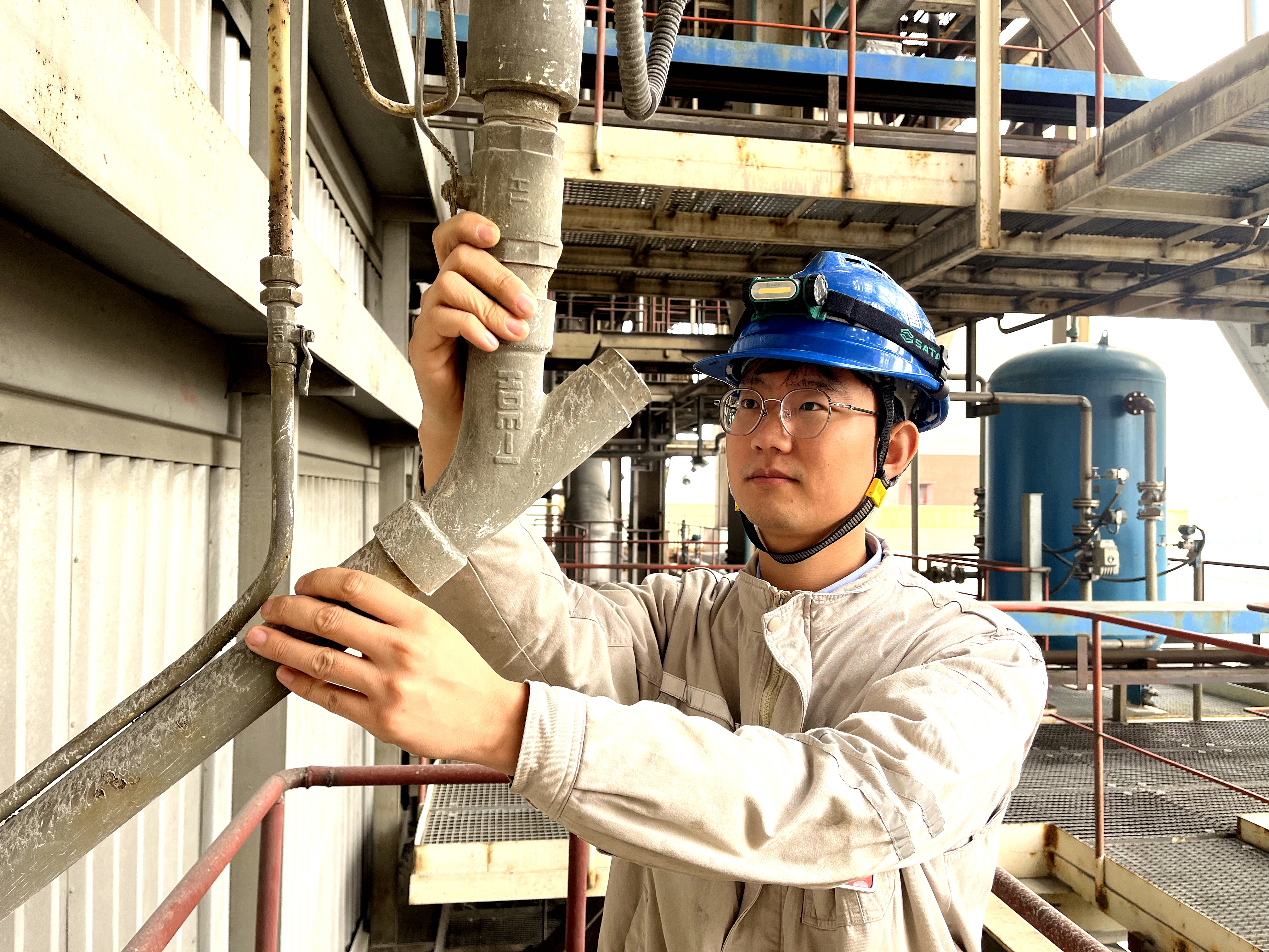 第一站是鍋爐房8米平臺。段科宇在轟鳴的設(shè)備間穿行,費了一番功夫,在一根粗大管道后面找到編號為7號的傳感器。他需要檢查它的外觀是否完好,連接線纜有無老化,并記錄運行參數(shù)。
