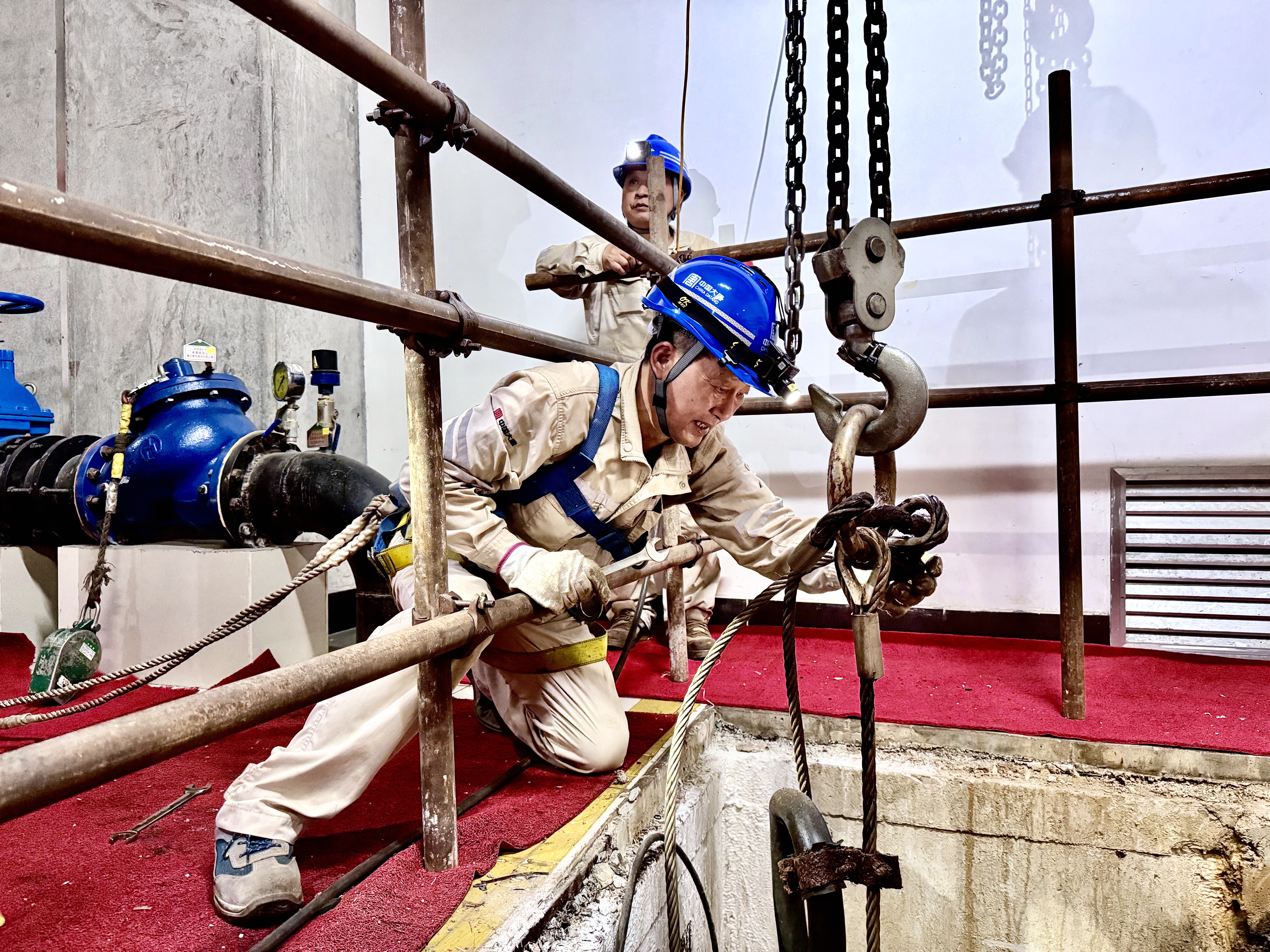 方案既定,張靈波再次探身幽井,汗珠砸在冰冷鋼索上。他艱難操控導鏈,試圖提起鋼絲繩以便卡新扣。井壁濕滑,空間逼仄,每一寸調整都耗盡心力。