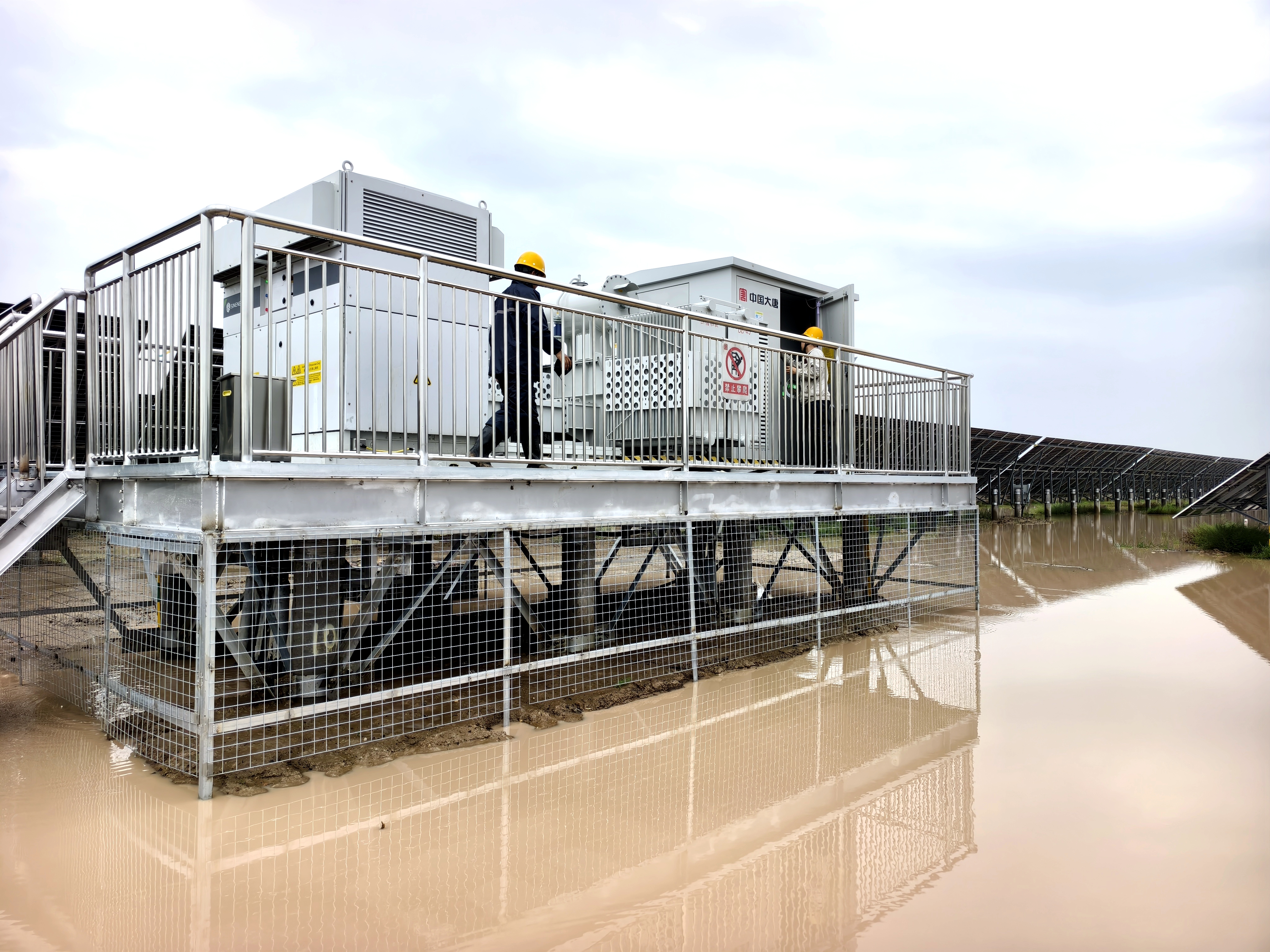 運(yùn)行人員是沖鋒在前的第一道防線。他們迅速穿戴好雨衣、雨褲和救生衣?!敖?、明瑞,跟我去二標(biāo)段!苗苗、德山去一標(biāo)段,瑞平和小徐去三標(biāo),大家注意現(xiàn)場涉水安全,水深泥滑,兩人一組,互相照應(yīng)!”班長李龍大聲叮囑。在泥濘的光伏陣列區(qū),積水最深處已沒過人大腿,他們深一腳淺一腳艱難跋涉。面對2米深的積水區(qū)域,三人筏板小組迅速成立?!皠幼鞣€(wěn),斷電操作按規(guī)程來,安全第一!”李瑞平一邊操作一邊提醒。對講機(jī)里不時(shí)響起各組的匯報(bào):“一標(biāo)段1號方陣1-12號匯流箱隔離完成!”“二標(biāo)段高風(fēng)險(xiǎn)點(diǎn)已斷電!”