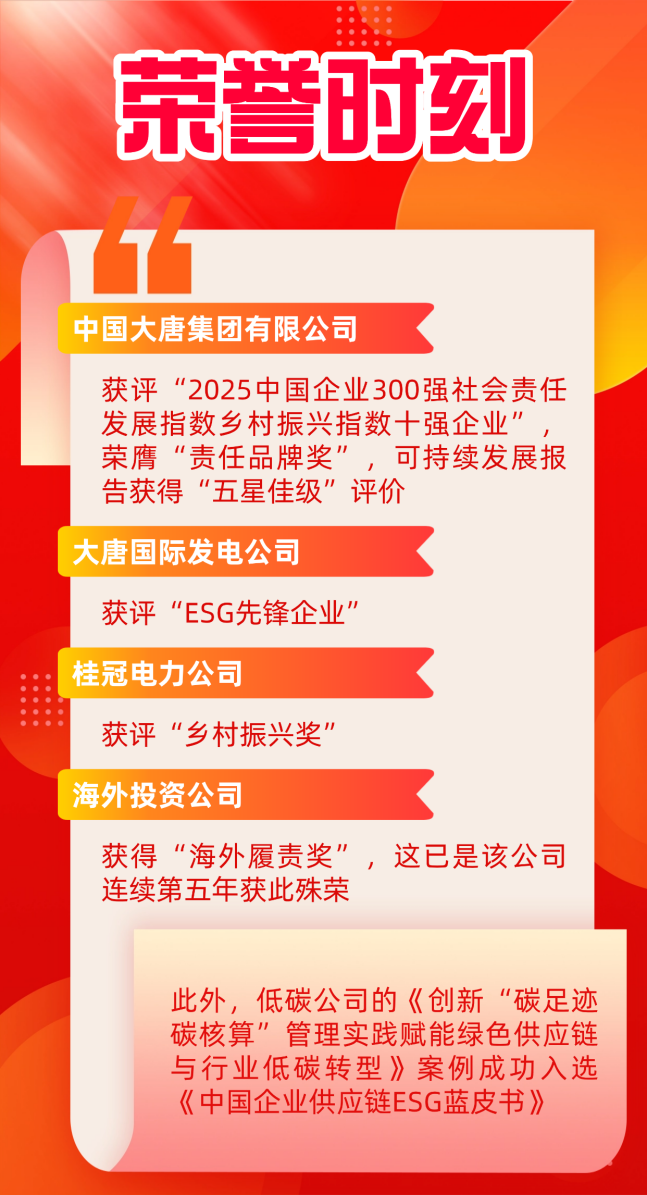 Datang International Power Generation Co., Ltd.?was recognized as an ESG Pioneer Enterprise, Guangxi Guiguan Electric Power Co., Ltd.?received?an award for its contributions to?rural revitalization, and China Datang Overseas Investment Co., Ltd.?won the award recognizing its overseas CSR initiatives?for the fifth consecutive year.